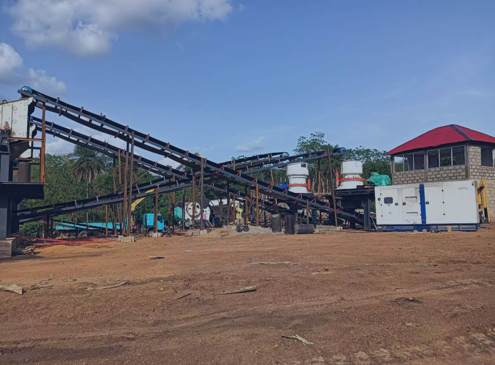 Mobile tire-mounted crushing plant workshop on-site